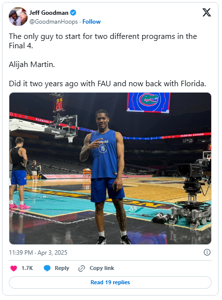 It was only appropriate that Alijah Martin delivered the most recent spark (or “strike,” as Hartman described it). At Florida Atlantic, Martin had been a key figure in the Owls’ unforgettable Cinderella journey to the Final Four. Now, in his graduate season with the Gators, his leadership, defensive presence, and steady voice have been indispensable. Florida would not be in this position without him.