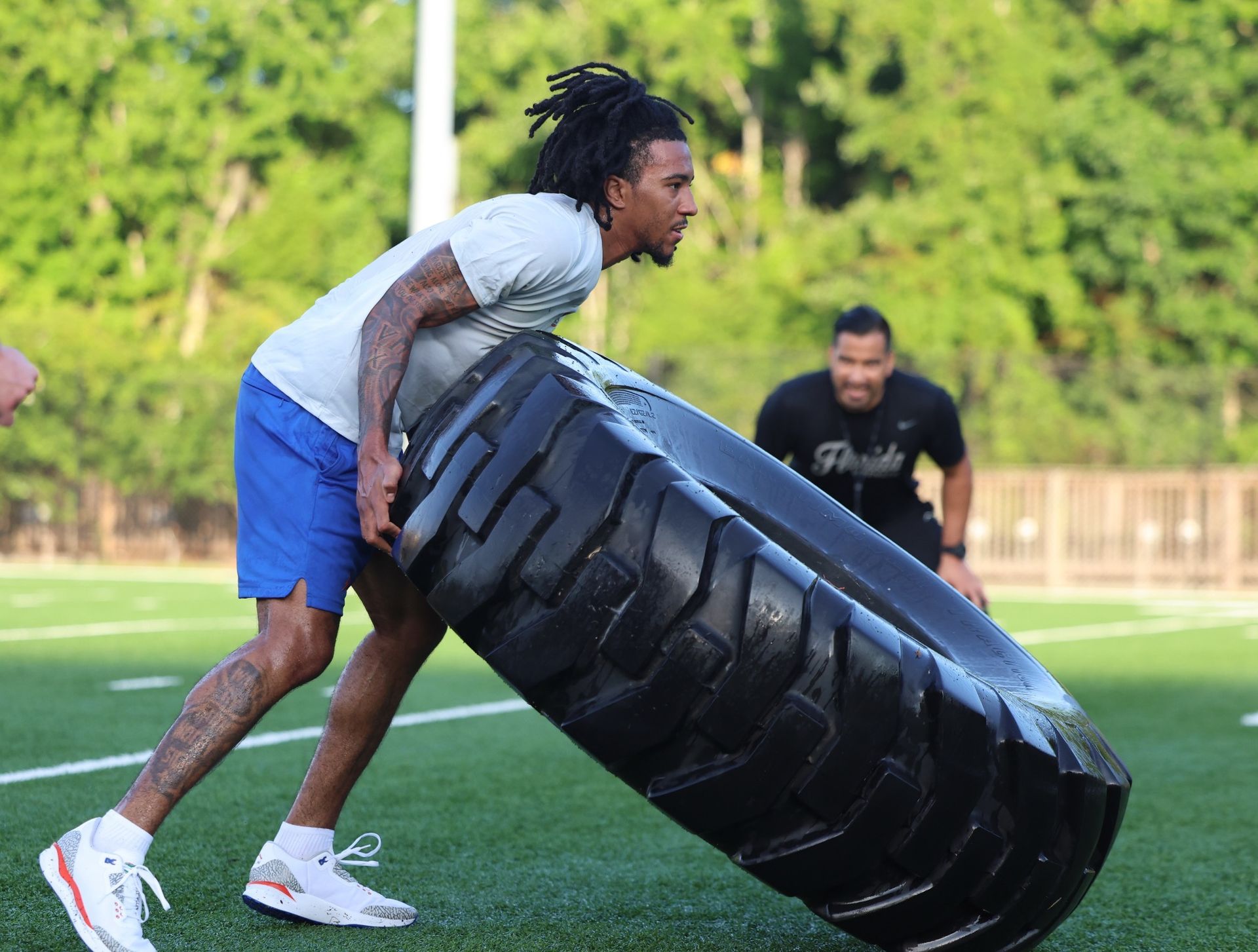 Recent arrival Boogie Fland, transfer point guard from Arkansas, flips the heavy tire under watchful eye of strength/conditioning coordinator Victor Lopez during Friday morning's training session.