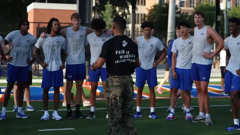 Friday marked the start of the official summer training period, and members of the 2025-26 UF basketball team were awake and active by 7 a.m. The squad was put through intense, military-style drills on the marching band practice field, organized by Strength and Conditioning Coordinator Victor Lopez. The demanding maneuvers were overseen by several U.S. Marines who traveled from Tampa at the invitation of Lopez, who is a former Marine himself.