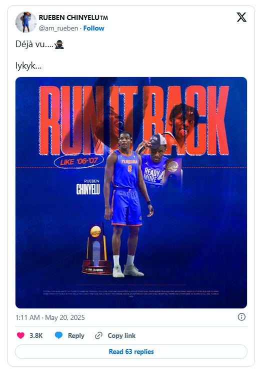 GAINESVILLE, Fla. — Rueben Chinyelu, a rising junior center, has announced via his social media accounts that he will step away from the NBA Draft process and return to Florida. Earlier this May, Chinyelu participated in the NBA G League Elite Camp held in Chicago from May 9–11.