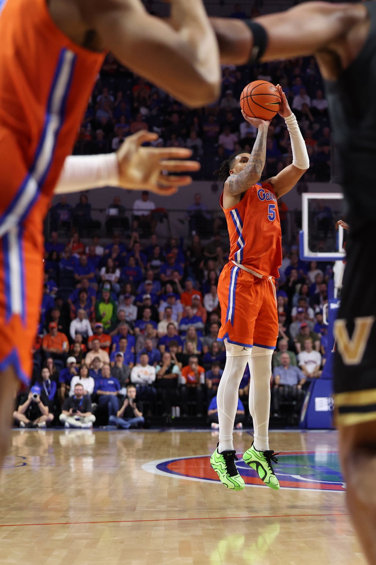With point guard and leading scorer Walter Clayton Jr. sidelined due to an ankle sprain, Coach Todd Golden required a collective effort against Vanderbilt — and that’s exactly what he received. The Florida bench contributed 21 points, while backup guard Denzel Aberdeen, making his first career start, delivered an excellent floor game. He directed an offense that shot 57.4 percent overall, including 10 of 21 from beyond the arc (47.6 percent), and recorded 20 assists (UF’s highest in SEC play this season) against 10 turnovers, with only three miscues over the final 30 minutes. … Offensively, Florida’s production remained strong, but what should have been a clear size advantage on the offensive glass failed to materialize. The Commodores held UF to just 10 offensive rebounds and 13 second-chance points. … On defense, the Gators dropped four spots after allowing Vanderbilt to shoot 51 percent, the second-best mark by a league opponent this season. Florida experimented with a 1-through-5 switching scheme not previously used in SEC play, but it proved ineffective as missed assignments gave Vandy opportunities. Still, the Commodores were limited to six 3-pointers, below their average of eight in SEC victories.