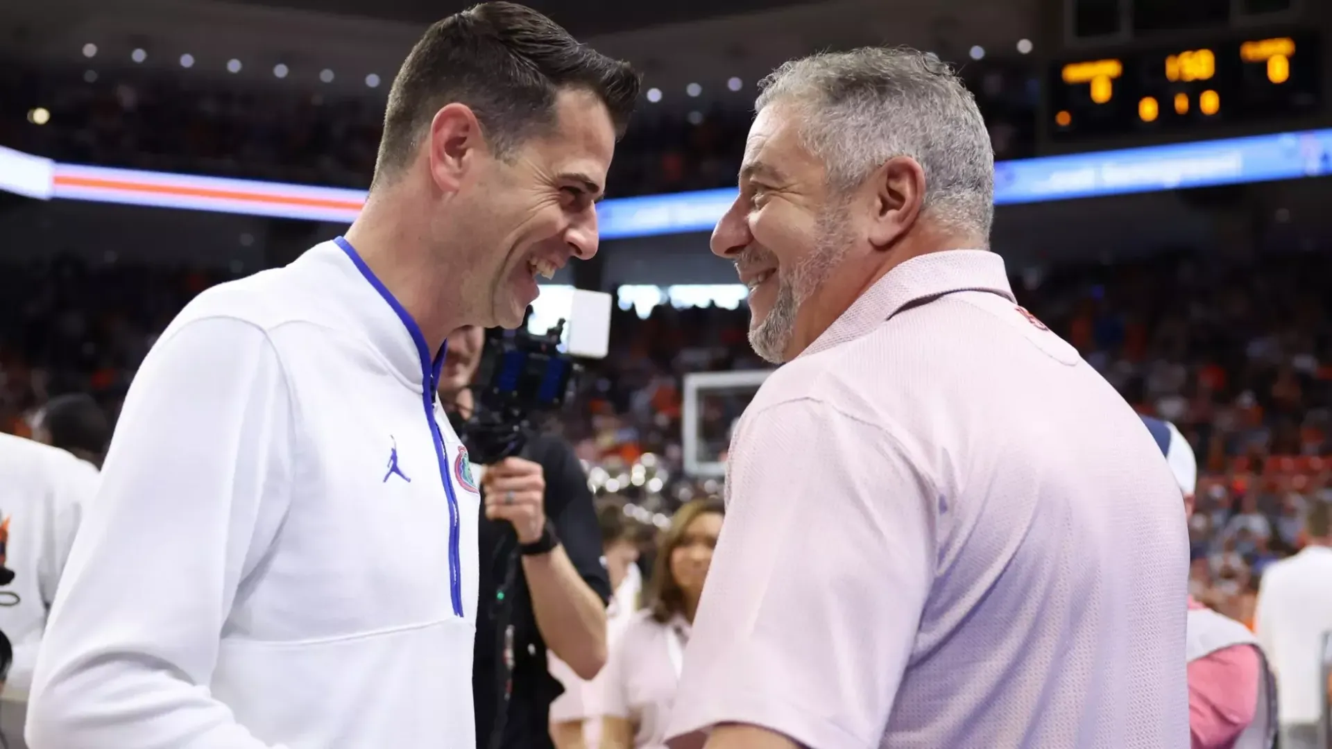 Gators head coach Todd Golden and Auburn head coach Bruce Pearl greet each other earlier this season when the Gators visited Auburn. (Photo: Maddie Washburn/UAA Communications)