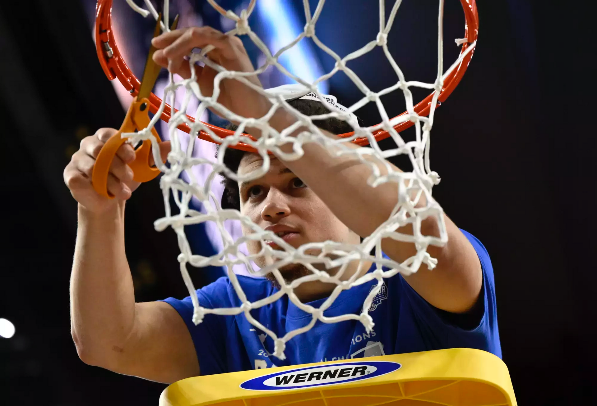 Walter Clayton Jr. snips down the championship net during the post-game celebration.