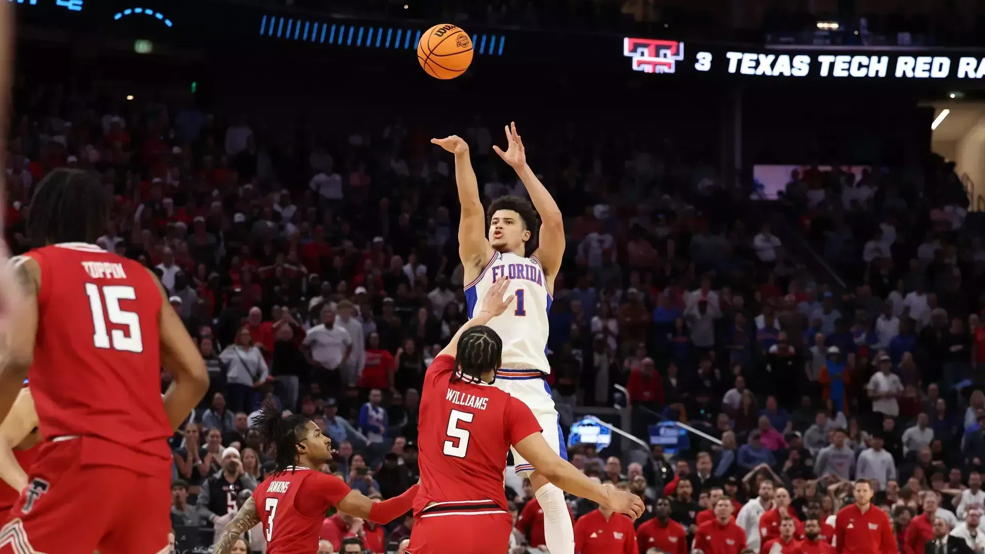 Florida then successfully fouled Toppin, still in the one-and-one. He missed again—his fifth miss from the line—and the Gators grabbed the rebound. In the halfcourt, Clayton received a pass on a cut, met a wall of defenders, pivoted back to the arc, and launched a go-ahead three over two Texas Tech players. Bang. The Red Raiders bench turned in disbelief.