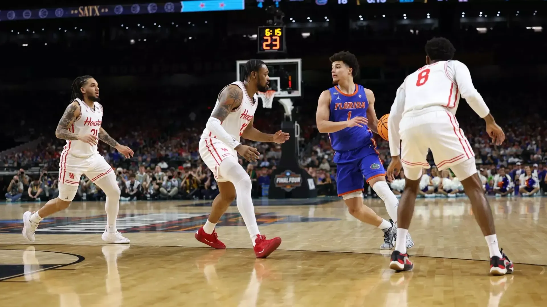With Florida clinging to a two-point lead and 19.7 seconds left, Houston advanced the ball past midcourt. L.J. Cryer passed to Milos Uzan on the right wing, but Florida’s defense held firm. Uzan returned the ball to Cryer, while Sharp sprinted from the low post to the perimeter. Clayton shadowed him the entire way.