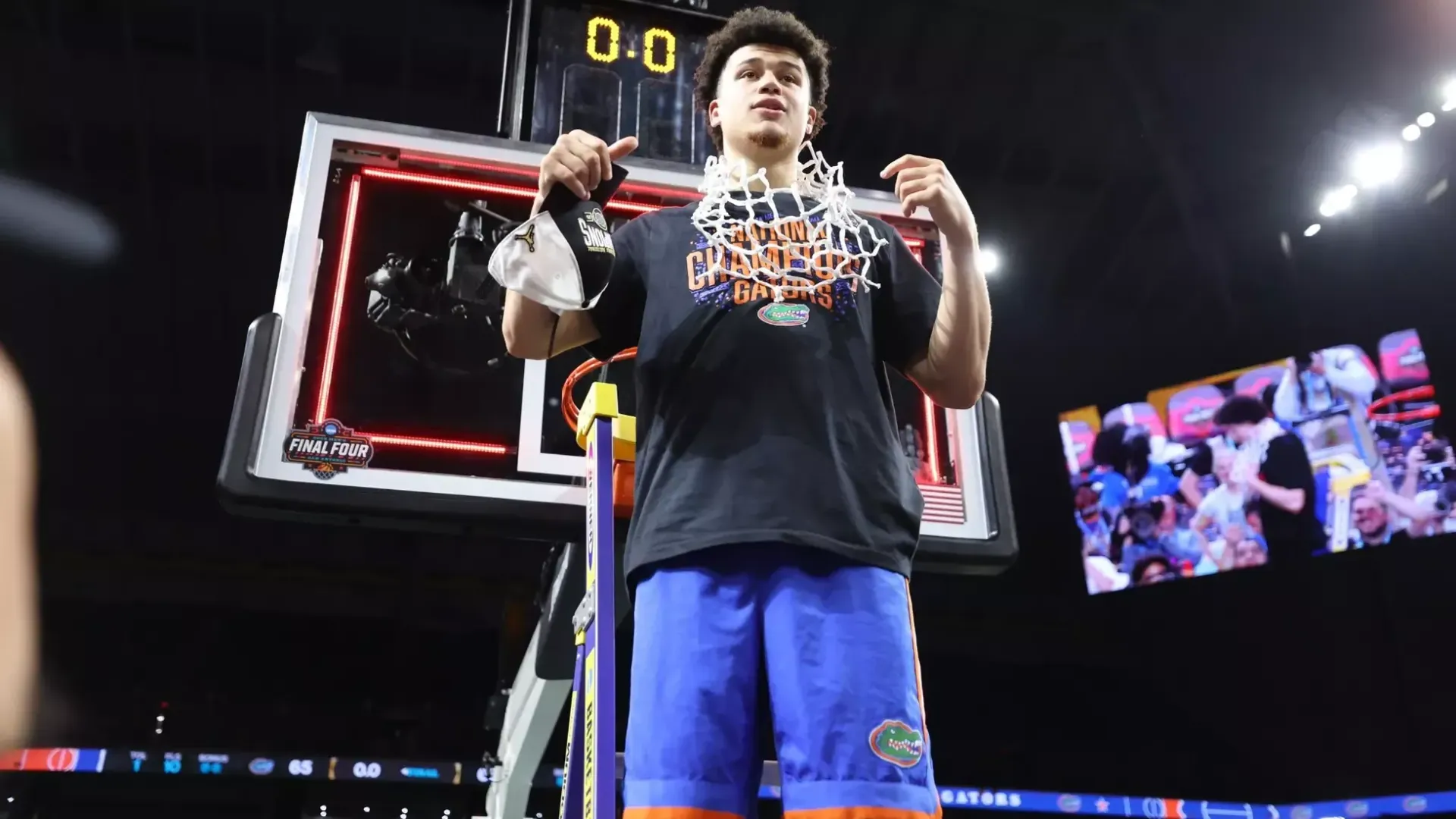 Walter Clayton Jr. stands at the top of a ladder -- and on top of the college basketball world -- after the Gators won the national championship Monday night over Houston. (Photo: Maddie Washburn/UAA Communications)