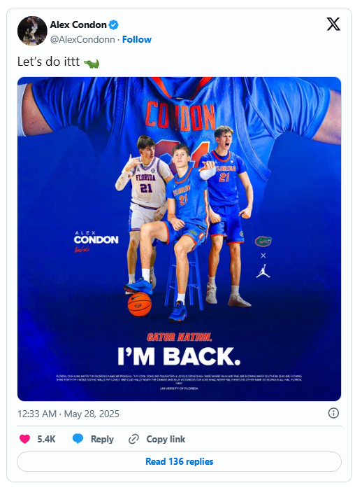 Condon cemented his legacy with a game-saving dive for a loose ball in the national championship, finishing with 12 points, seven rebounds, and four steals to help secure the title. Florida’s entire starting frontcourt from that championship run will return for the 2025–26 season. In the backcourt, Urban Klavžar and Isaiah Brown are back, joined by incoming talent AJ Brown, Boogie Fland, CJ Ingram, Xaivian Lee, and Alex Lloyd.