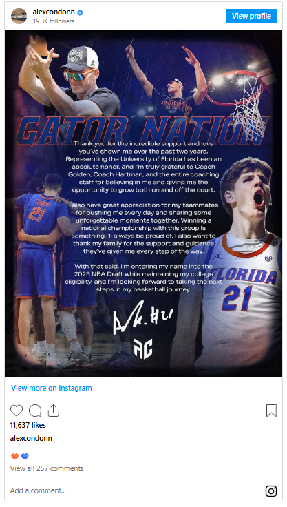 Alex Condon—Florida’s leading rebounder and fourth in scoring—announced his decision to enter the NBA Draft evaluation process while preserving the option to return to college play. The move aligned with what head coach