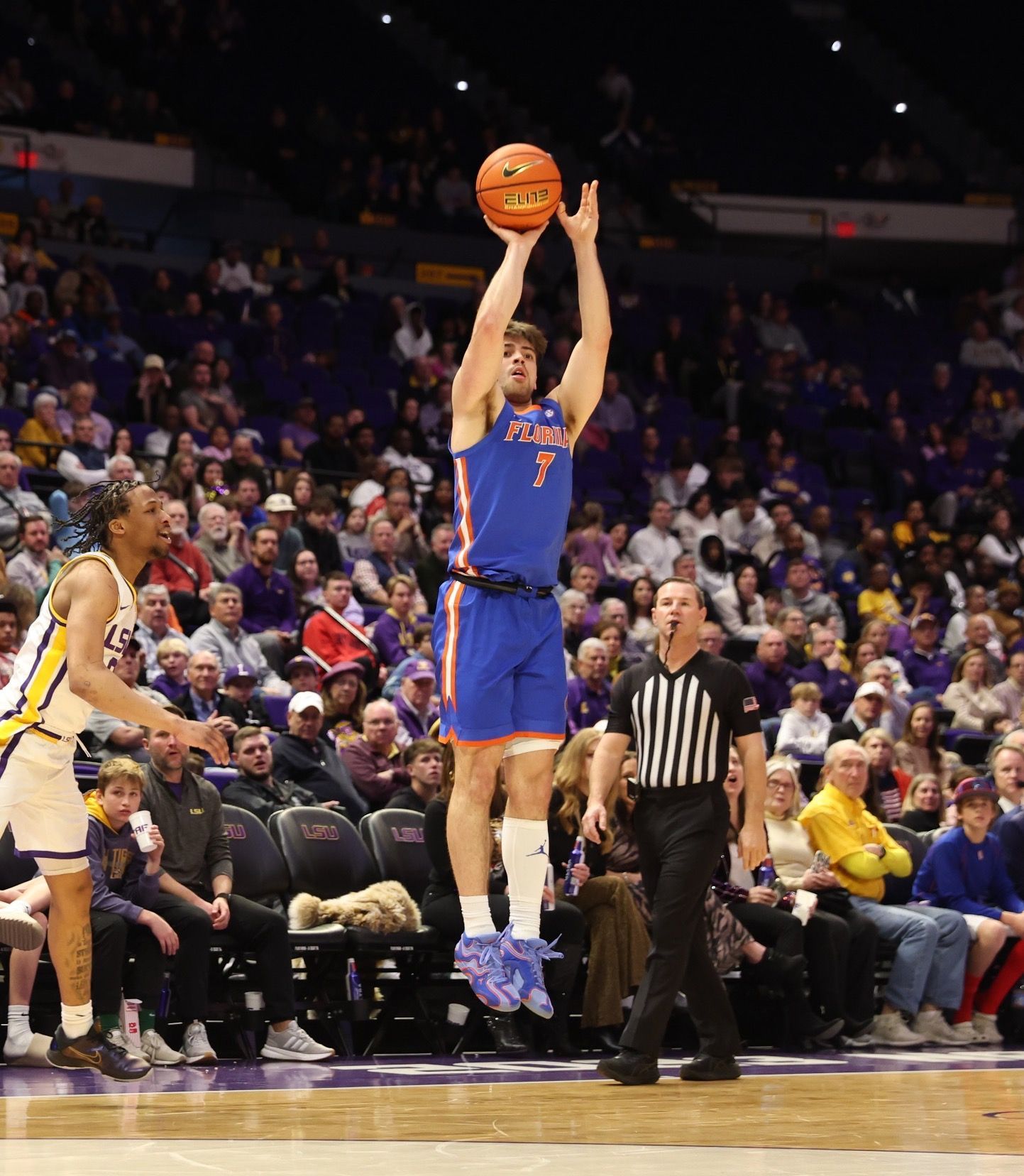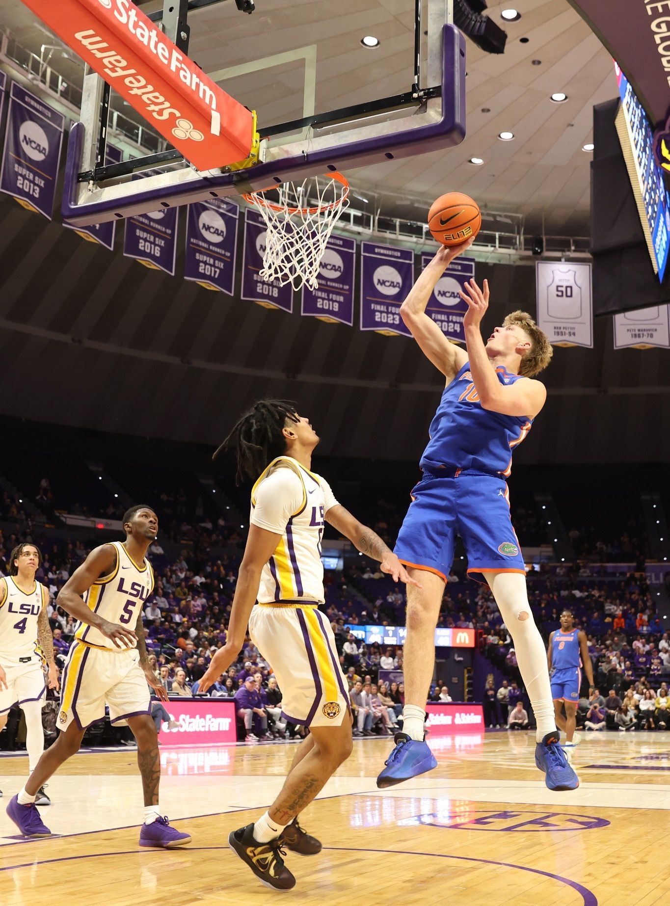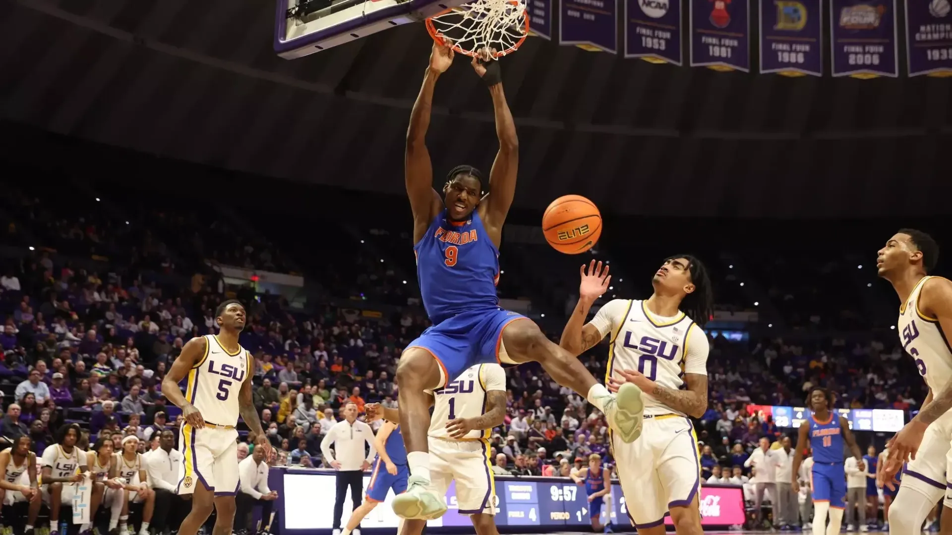 LSU’s Robert Miller III (19 points, 10 rebounds) cut the margin to three with a layup, but Klavzar immediately answered with a 3-pointer at 10:42 — his sixth straight game with a make from deep — to push the lead back to six. Moments later, Haugh soared for a put-back dunk, then drove the lane for another slam, aided by a strong seal from Handlogten, to give Florida an eight-point cushion with 8:56 remaining.