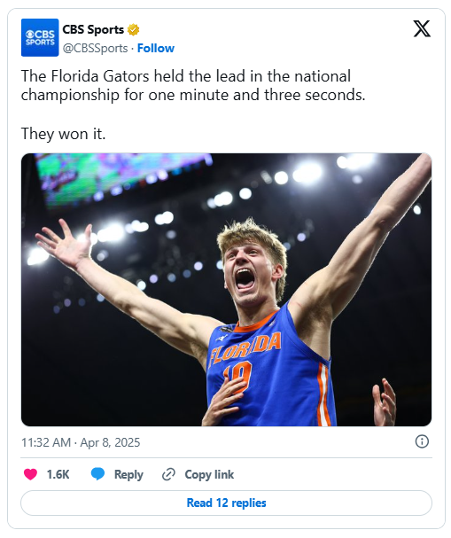 This marked Florida’s fifth double-digit comeback win of the season and the third-largest rally in NCAA championship game history. The Gators held the lead for just 63 seconds.