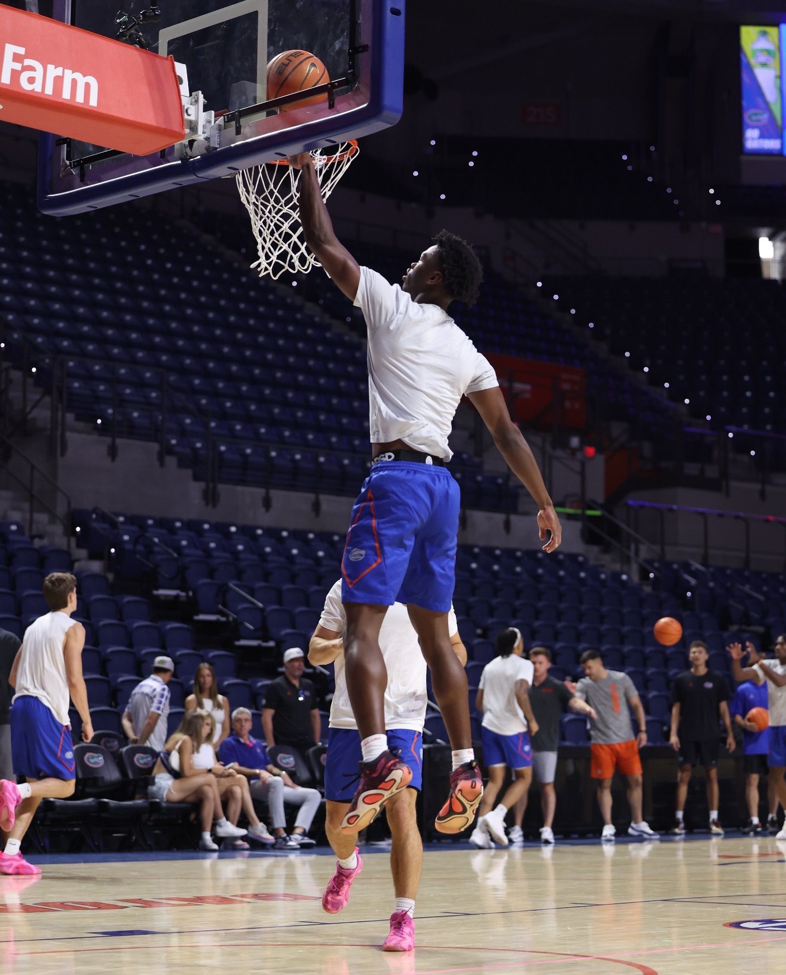 Take Tuesday’s scrimmage at the Exactech Arena/O’Connell Center, officiated by NCAA referees. The Blue team forced a stop and pushed the ball in transition. Fland advanced the ball to Ingram in the right corner. After a ball fake, Ingram drove into the lane but was cut off by a defender. Rather than forcing a shot, he kicked the ball out to Haugh at the top of the key. Haugh quickly swung it to the left corner, where Klavzar was waiting for a clean look at a three-pointer. Swish.