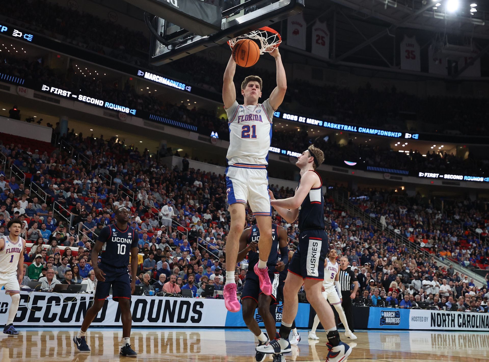 Off the bench, Thomas Haugh (9.4 ppg, 5.9 rpg) was efficient inside, going 5-of-6 on 2-point attempts in Raleigh, though he missed all seven of his 3-point tries. He also grabbed 16 rebounds and dished out seven assists. Backup center Micah Handlogten (2.7 ppg, 5.5 rpg) went scoreless against UConn, missing all three of his shots, but pulled down four boards. He posted a minus-4 in the box score—one of only two Gators in the negative. The other was reserve guard Denzel Aberdeen (7.9 ppg), who logged three points on three attempts in 14 minutes and finished at minus-1.