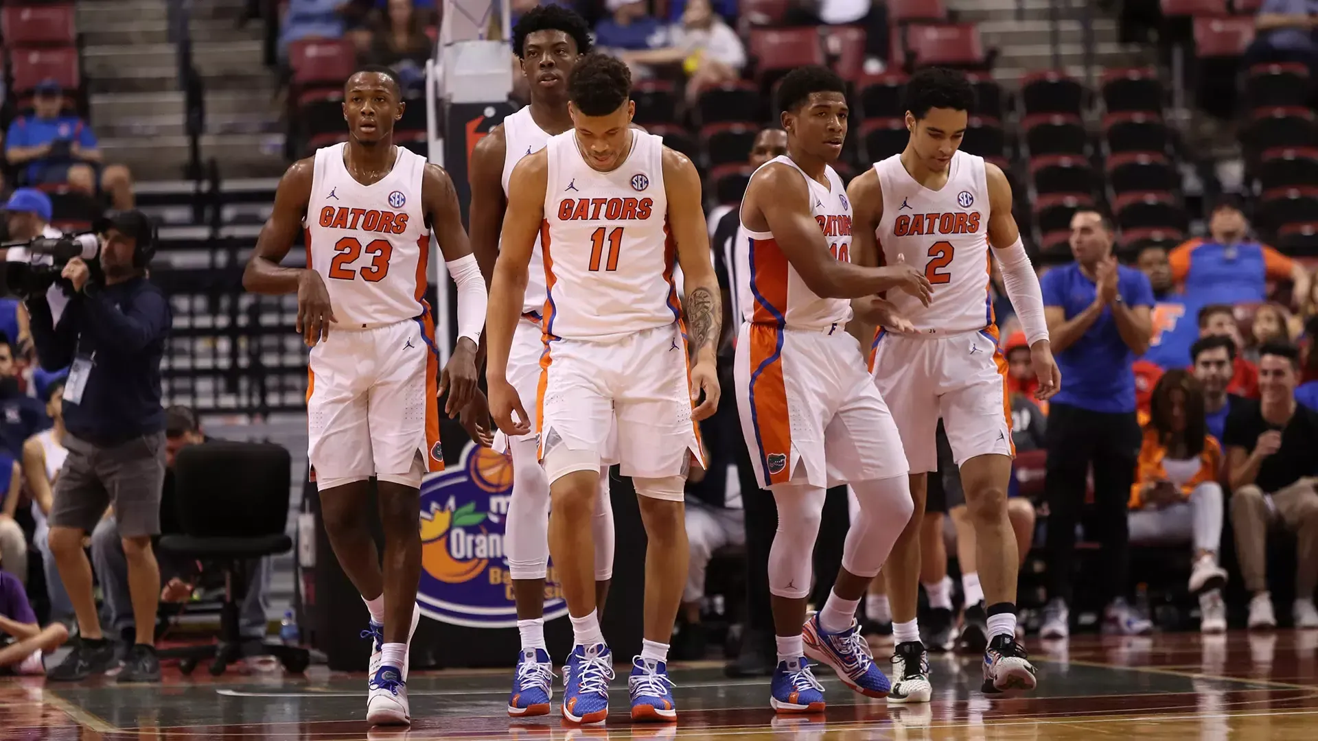 From left: Scottie Lewis, Omar Payne, Keyontae Johnson, Noah Locke and Andrew Nembhard during UF's last loss in the Orange Bowl Classic (and one of only four during their 23 appearances), a 65-62 setback against Utah State on Dec. 21, 2019.