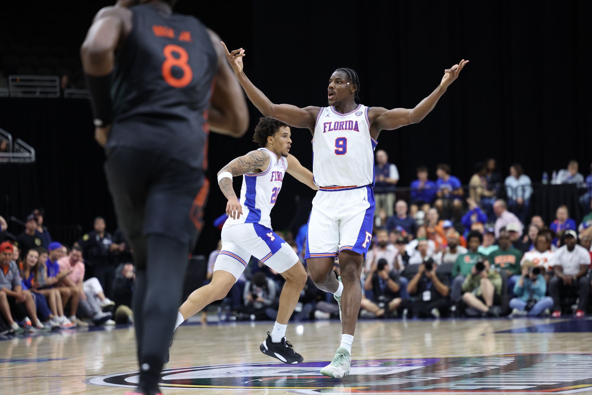 Gators center Rueben Chinyelu (9) finished with 16 points, 12 rebounds and several gestures to the fans.