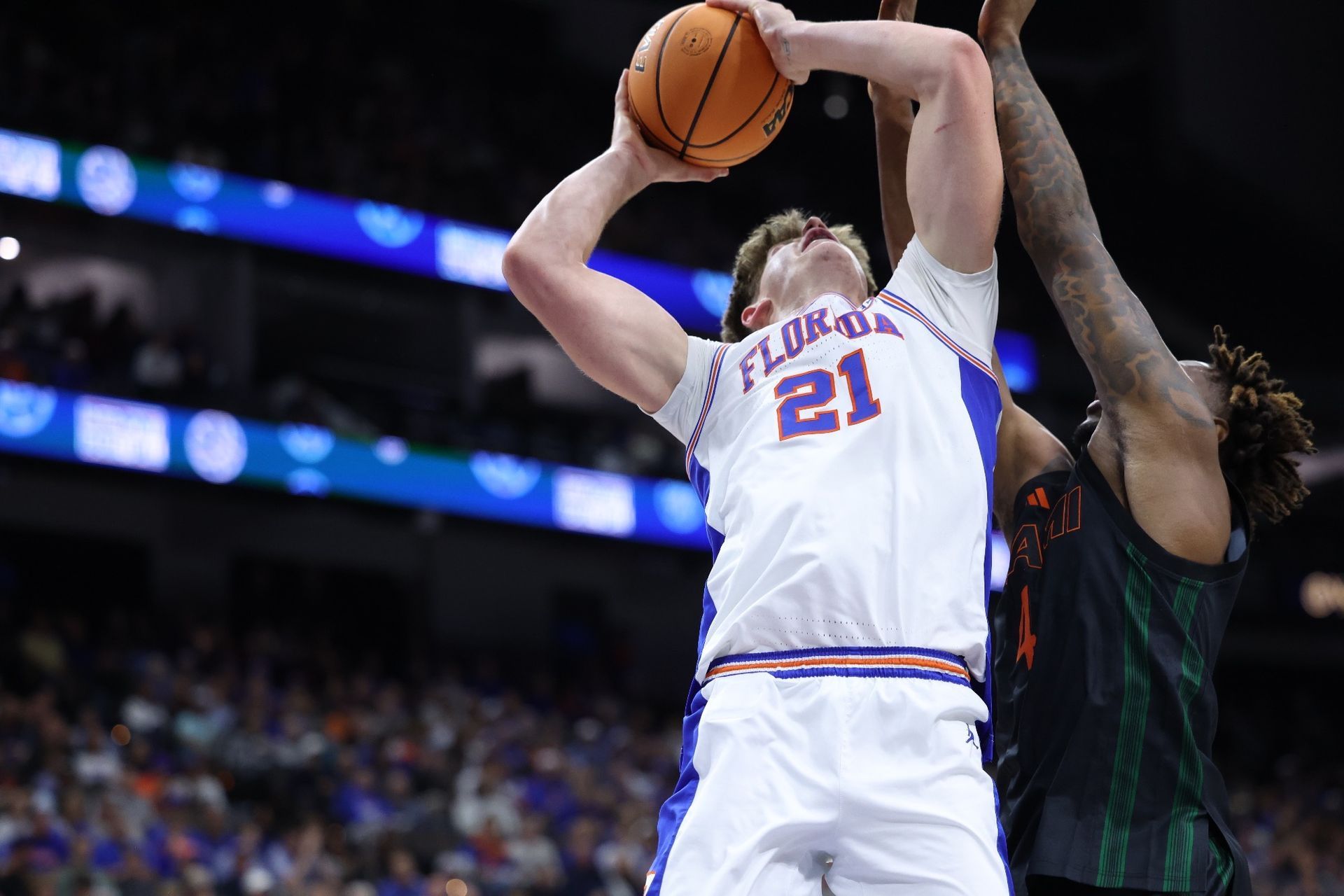 Florida forward Alex Condon (21) going to work down low on his way to 19 points and seven rebounds.