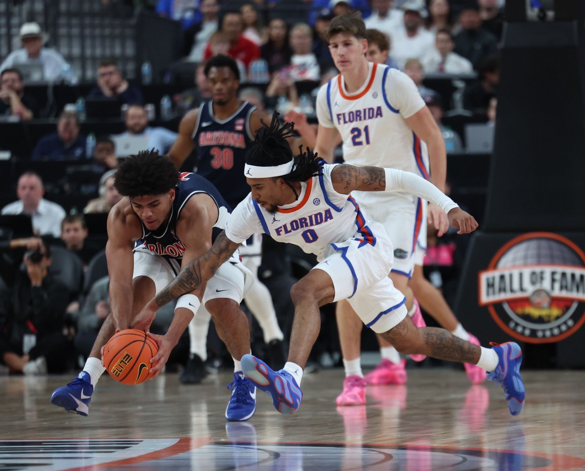 And speaking of Florida point guards, sophomore transfer and former McDonald's All American Boogie Fland struggled in his UF debut. He finished with nine points on 3-for-9 shooting, missed a couple of 3s, and tallied just three assists, while being matched up against Arizona’s Jaden Bradley, who poured in 27 points. Still, Fland deserves some leeway. At just 19 years old, he was playing in only his fourth game of the calendar year, a stretch that included two surgeries. It was also just the 22nd game of his collegiate career, compared to Bradley, a 22-year-old and fellow McDonald's All American, who was appearing in his 111th. Fland did log 32 minutes without committing a turnover and was effective in initiating Florida’s offense, though the team as a whole shot poorly (43% overall, just 7-for-27 from deep).