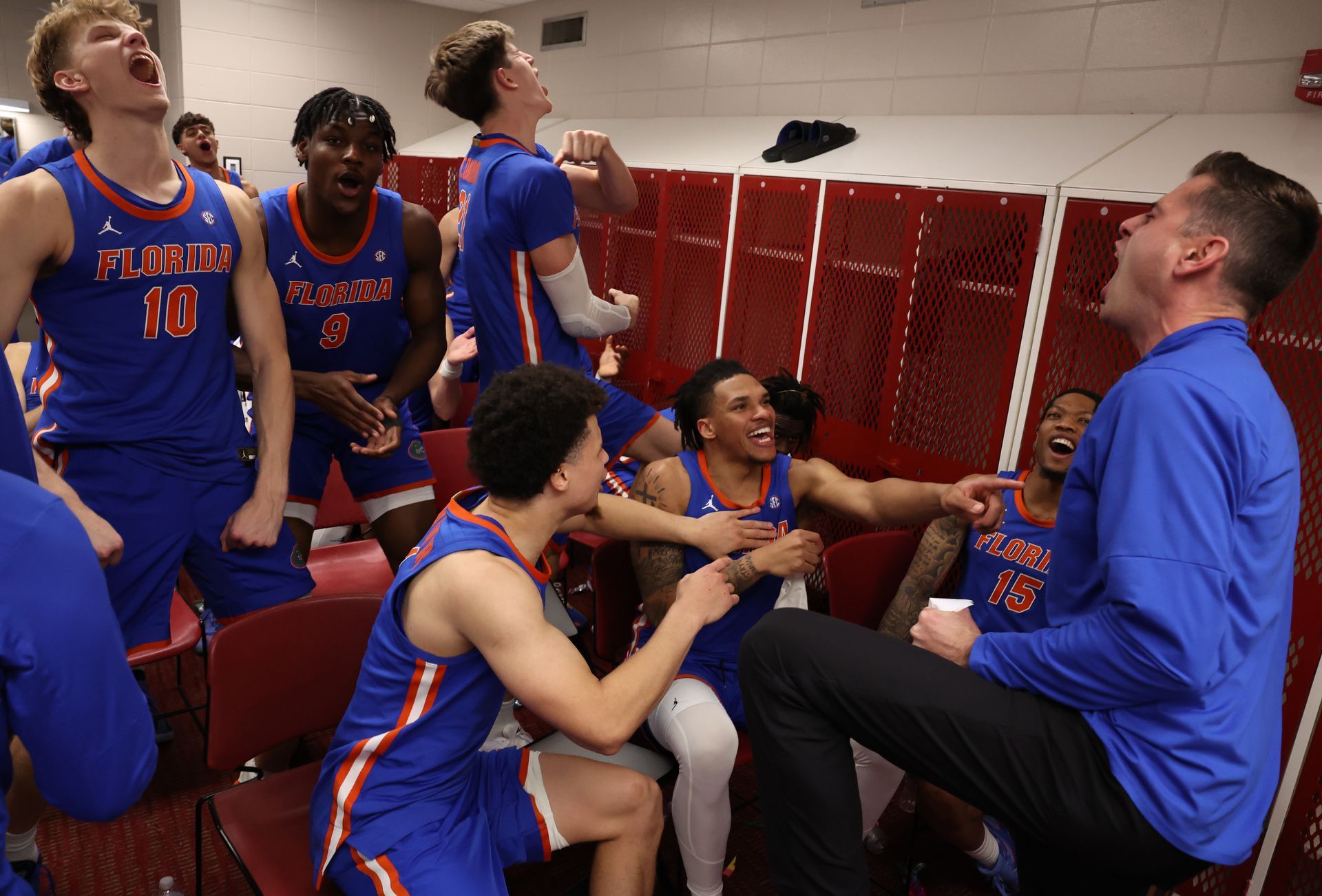 UF coach Todd Golden (right) and his team in the post-game (and winning) visitors' locker room.