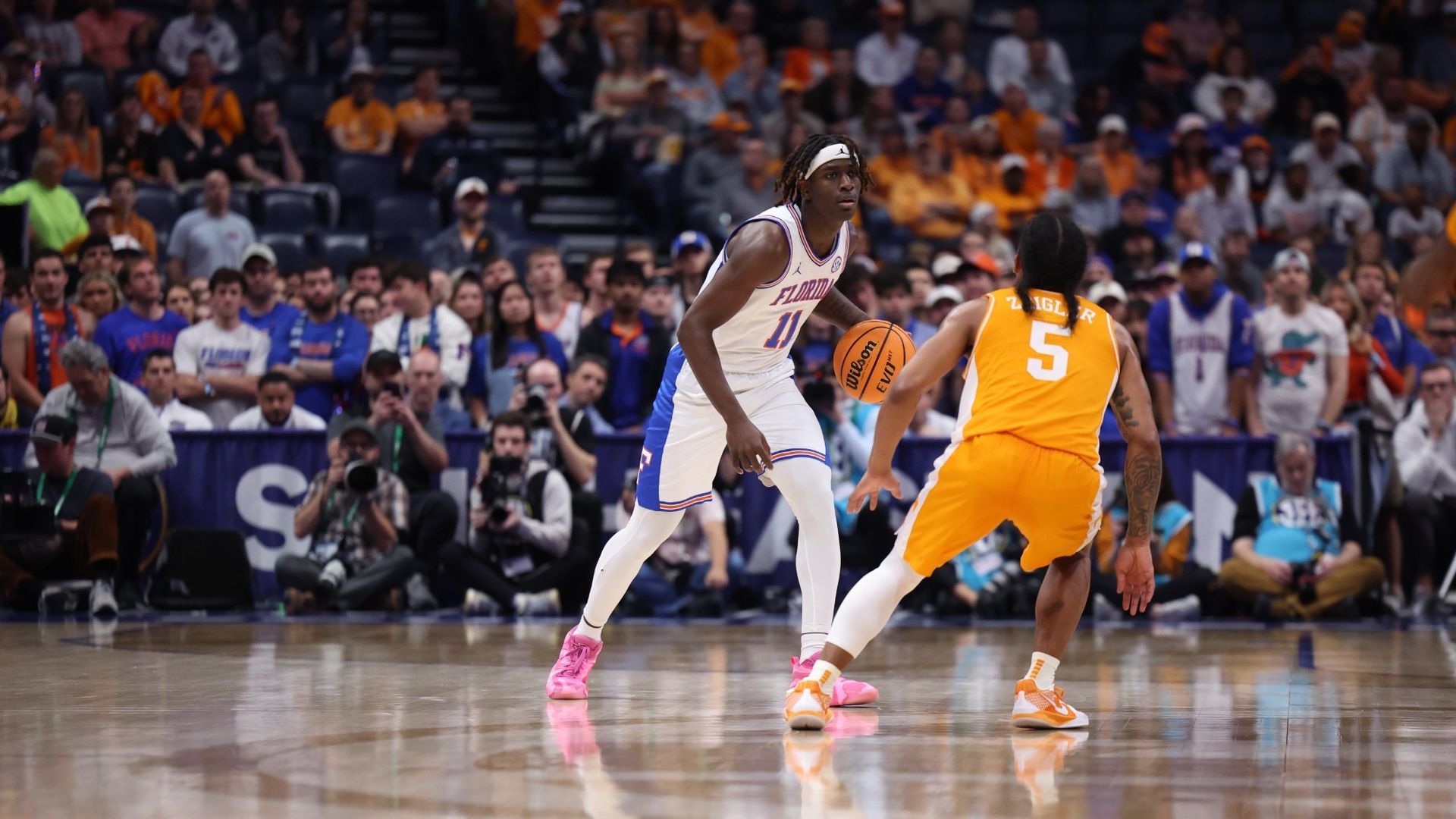 UF junior guard Denzel Aberdeen (11) surveys Tennessee's Zakai Zeigler and the Volunteers' defense during Sunday's SEC Tournament championship game.