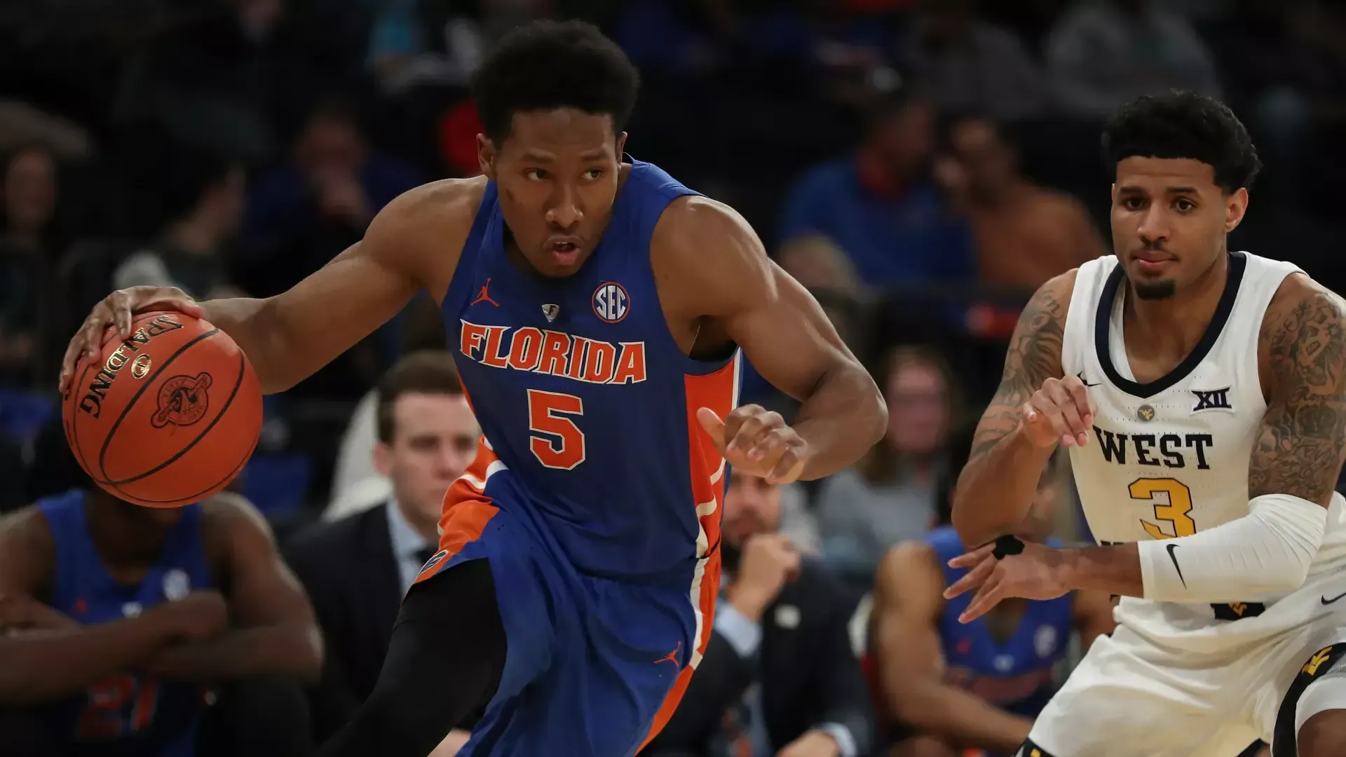 UF guard KeVaughn Allen (5) against West Virginia at The Garden in 2018.