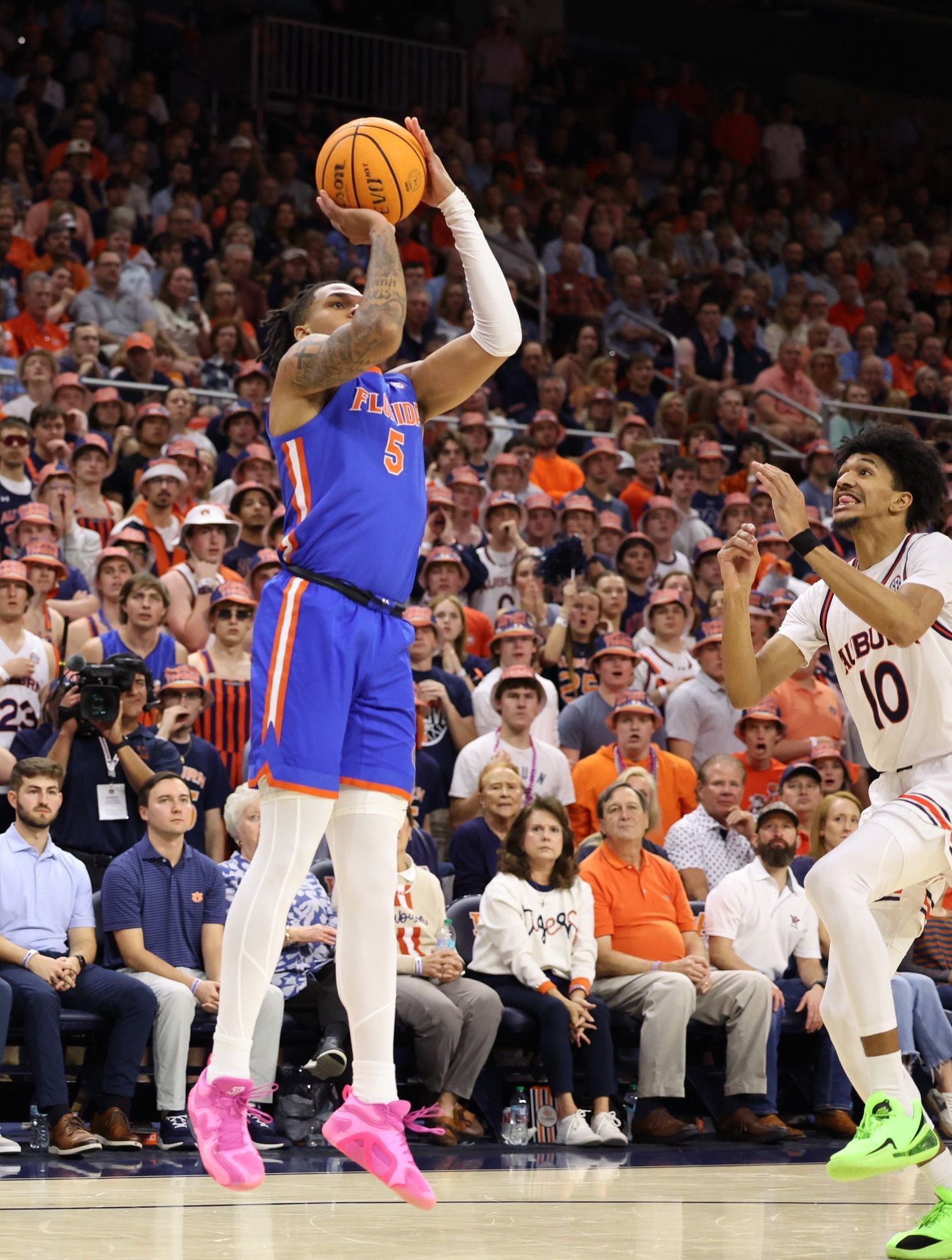 Walter Clayton Jr. (1) lets one of his four made 3-balls fly Saturday in UF's upset win at No. 1 Auburn.