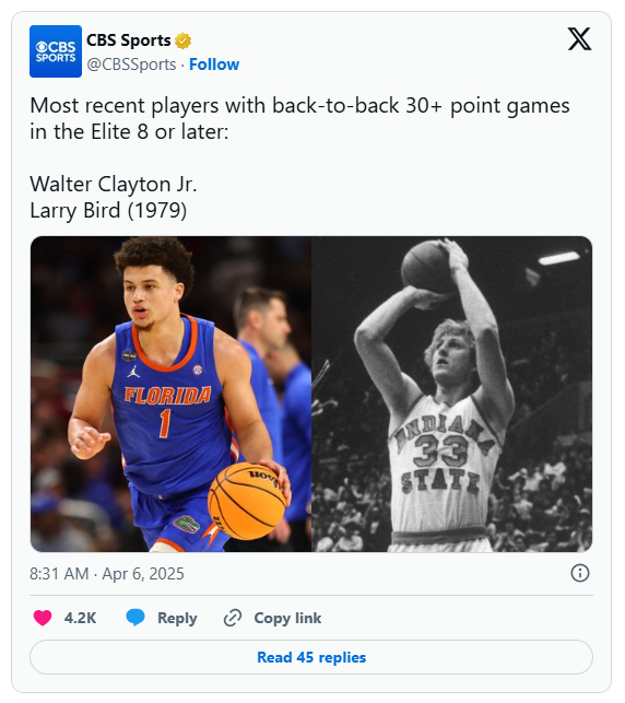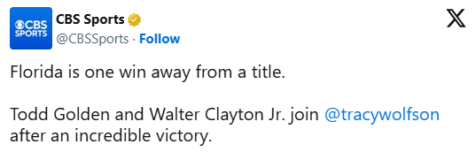 What Clayton didn’t emphasize was his own second-half heroics. He poured in 20 of his career-high 34 points after the break, hitting clutch shots down the stretch to fuel Florida’s rally from nine points down. The Gators ultimately secured a 79–73 win over Auburn, advancing to their first NCAA championship game since 2007, when they capped off back-to-back national titles under Billy Donovan.