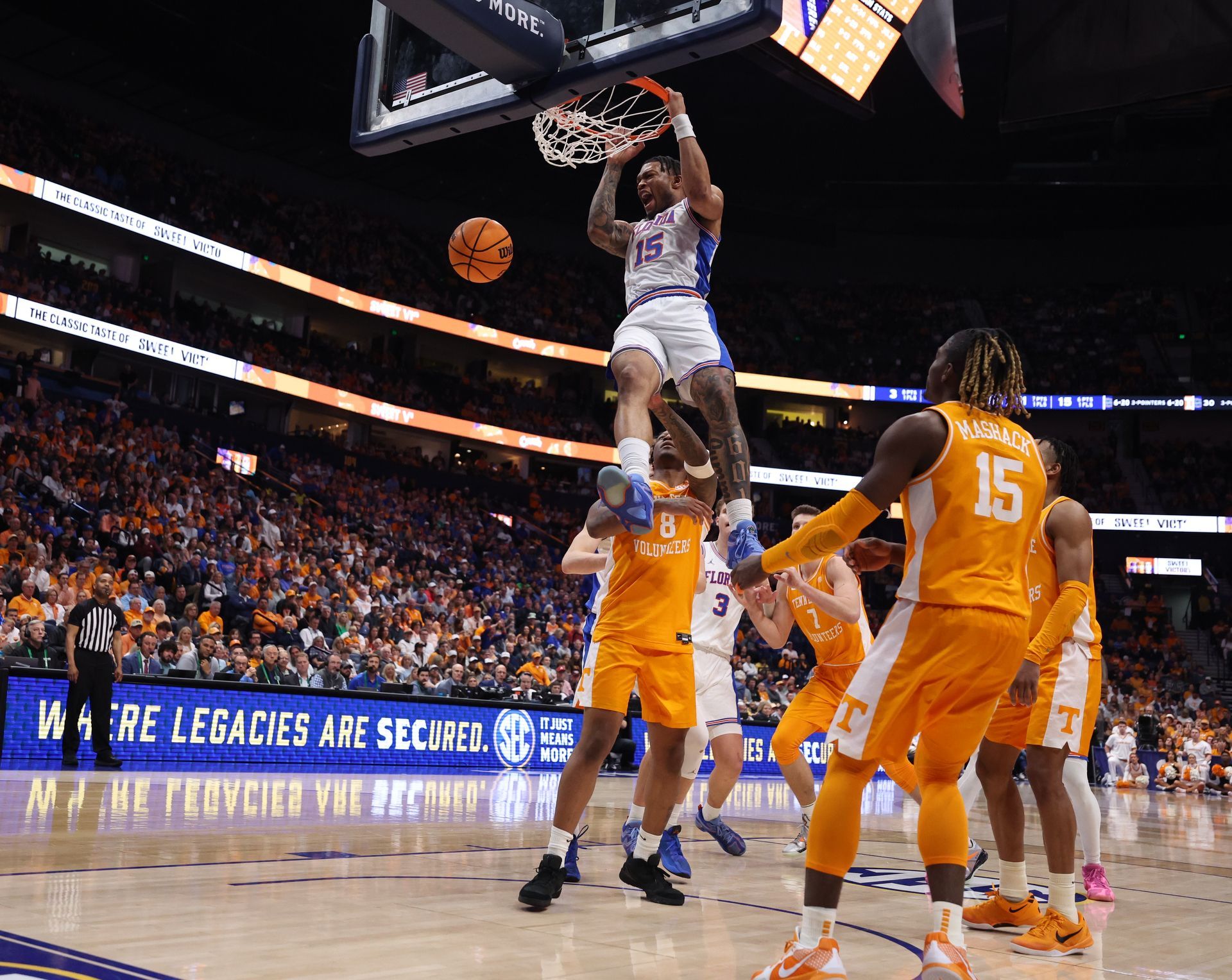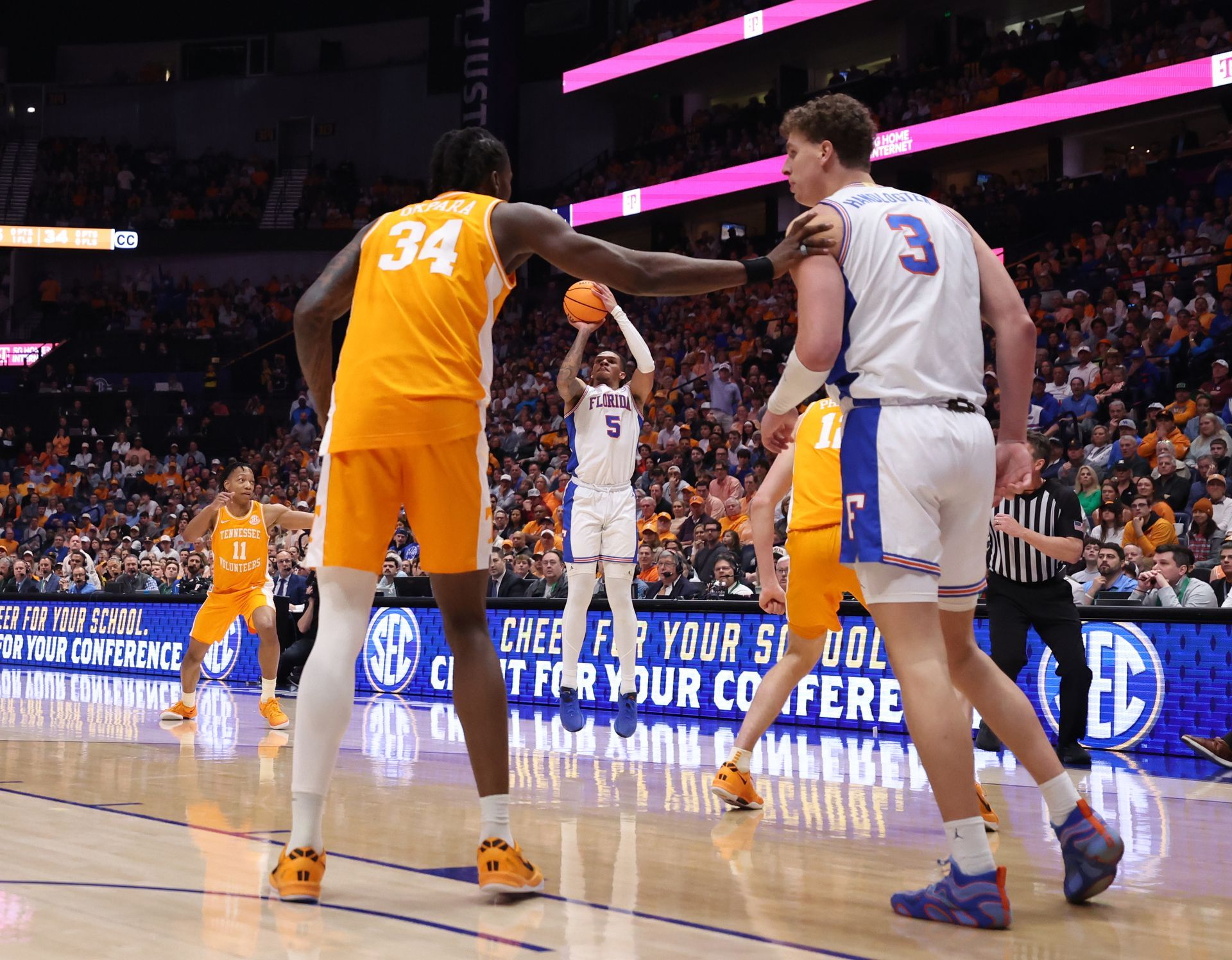 The Gators broke a 16–16 tie with a 16–4 surge late in the first half to build a 12-point lead. Tennessee trimmed the margin, but junior guard Denzel Aberdeen (9 points) drilled a deep three-pointer at the halftime buzzer to send Florida into the locker room ahead 39–30.