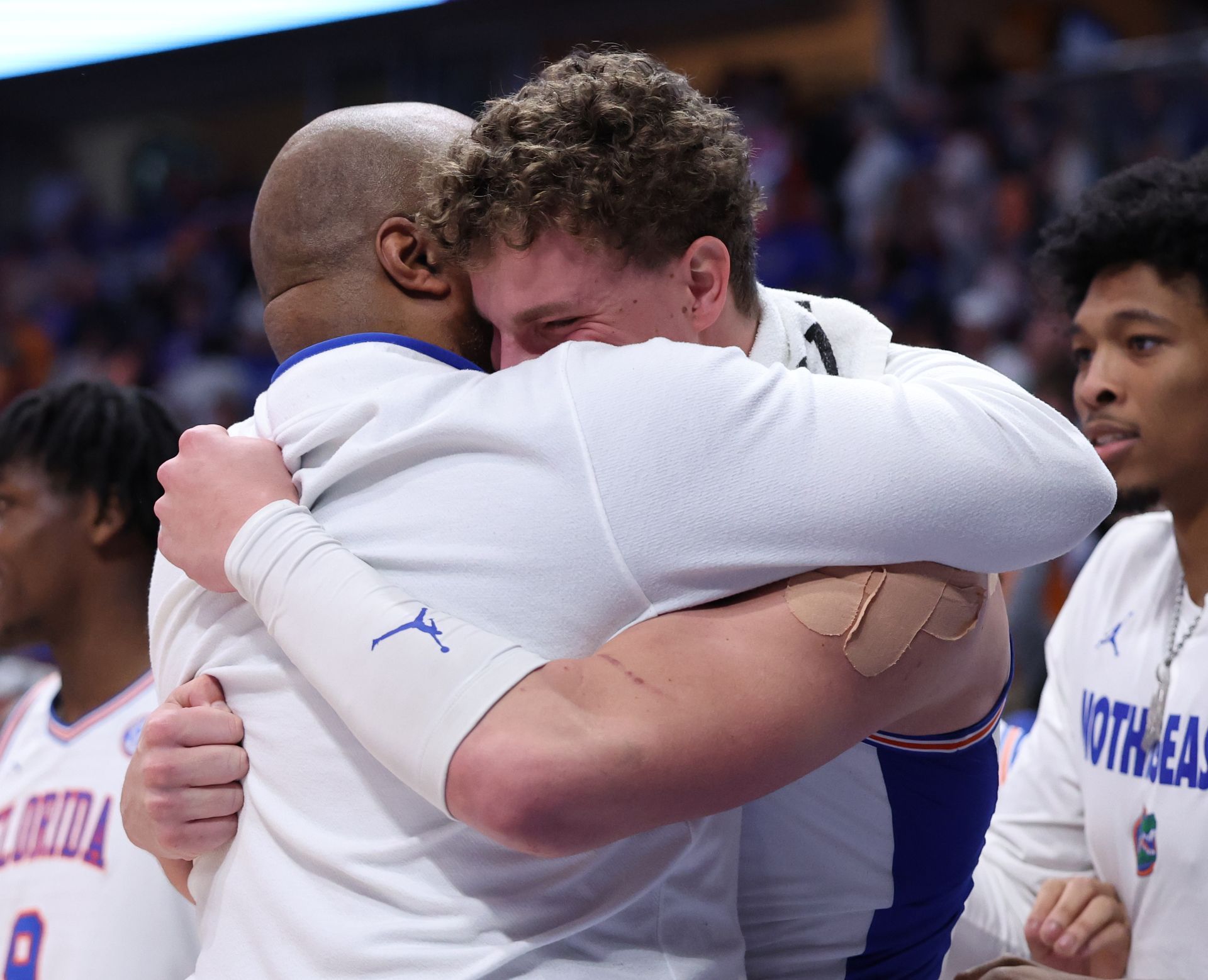 Celebration erupted on the Florida bench, highlighted by Associate Head Coach Carlin Hartman sharing an emotional embrace with junior center Micah Handlogten. The moment carried special meaning, as Handlogten had suffered a broken leg on the same floor during the 2024 title game. The two had wept together then, and this time they did so again — as champions.