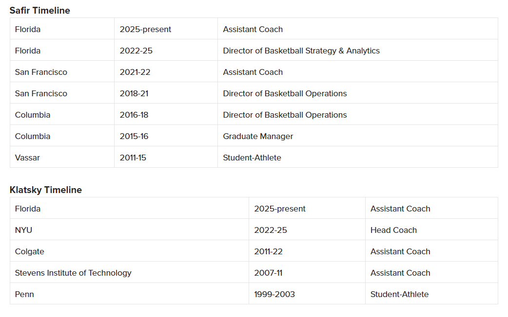 The Florida men's basketball program is making key additions to its coaching staff, as announced by head coach Todd Golden on Tuesday. Jonathan Safir, who has served as UF’s director of basketball strategy and analytics since 2022, has been elevated to an assistant coach position. Joining him is Dave Klatsky, who comes to Gainesville after leading New York University’s program for the past three seasons.