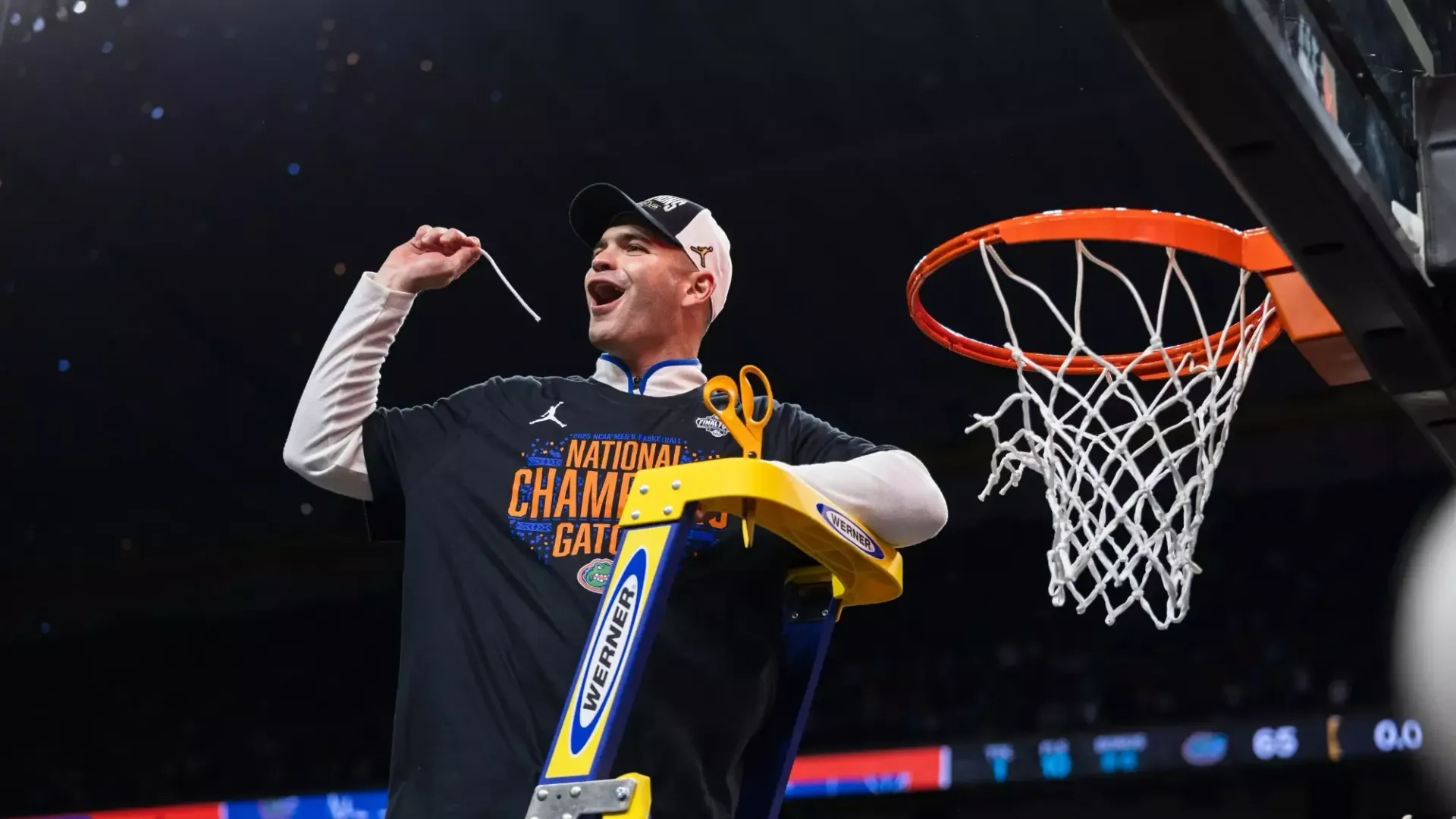 Jonathan Safir cuts a piece of the net following the Gators' national championship victory. (Photo: Spencer Gnauck)
