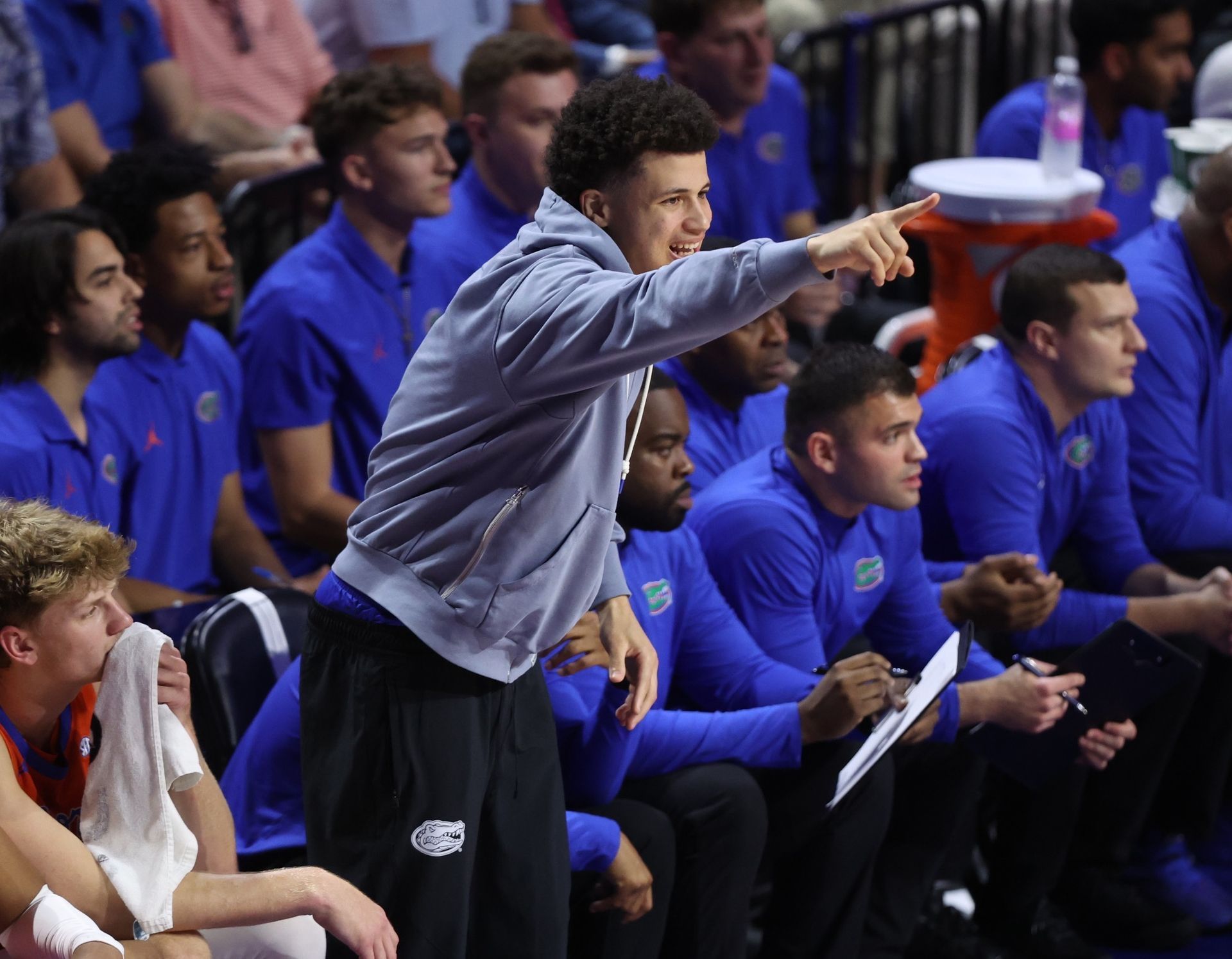 Senior guard Walter Clayton Jr., sidelined with a sore ankle, cheers on his teammates during Tuesday night's home win against Vanderbilt.