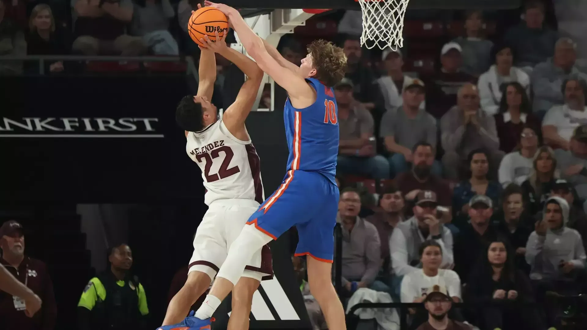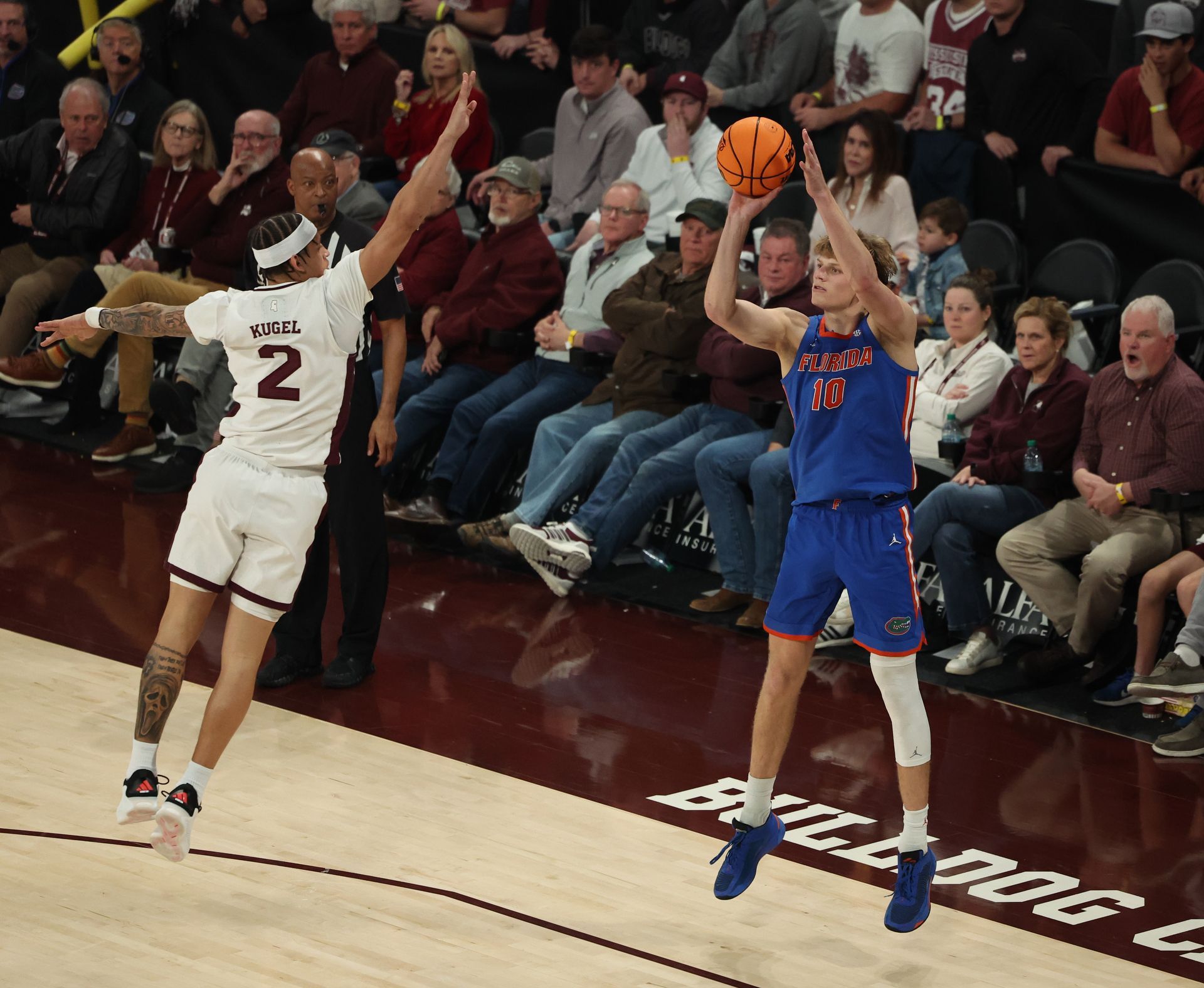 The first half was a grind. Florida shot just 36.7 percent, went 6-of-20 from deep, and was outrebounded 26–16, including 8–2 on the offensive glass. Mississippi State struggled too, hitting 36.4 percent overall and only 2-of-15 from three. The Bulldogs led 34–33 at the break.
