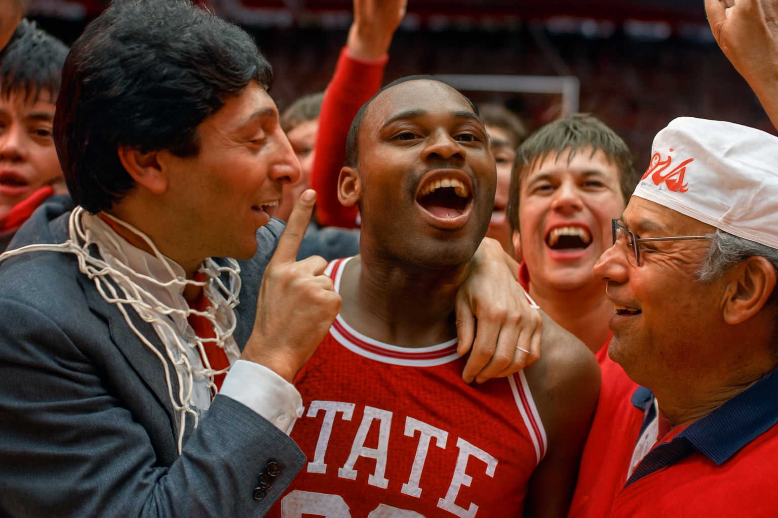 NC State coach Jim Valvano (left) and guard Dereck Whittenburg (center) celebrate the Wolfpack's buzzer-beating defeat of Houston in the 1983 NCAA championship game.