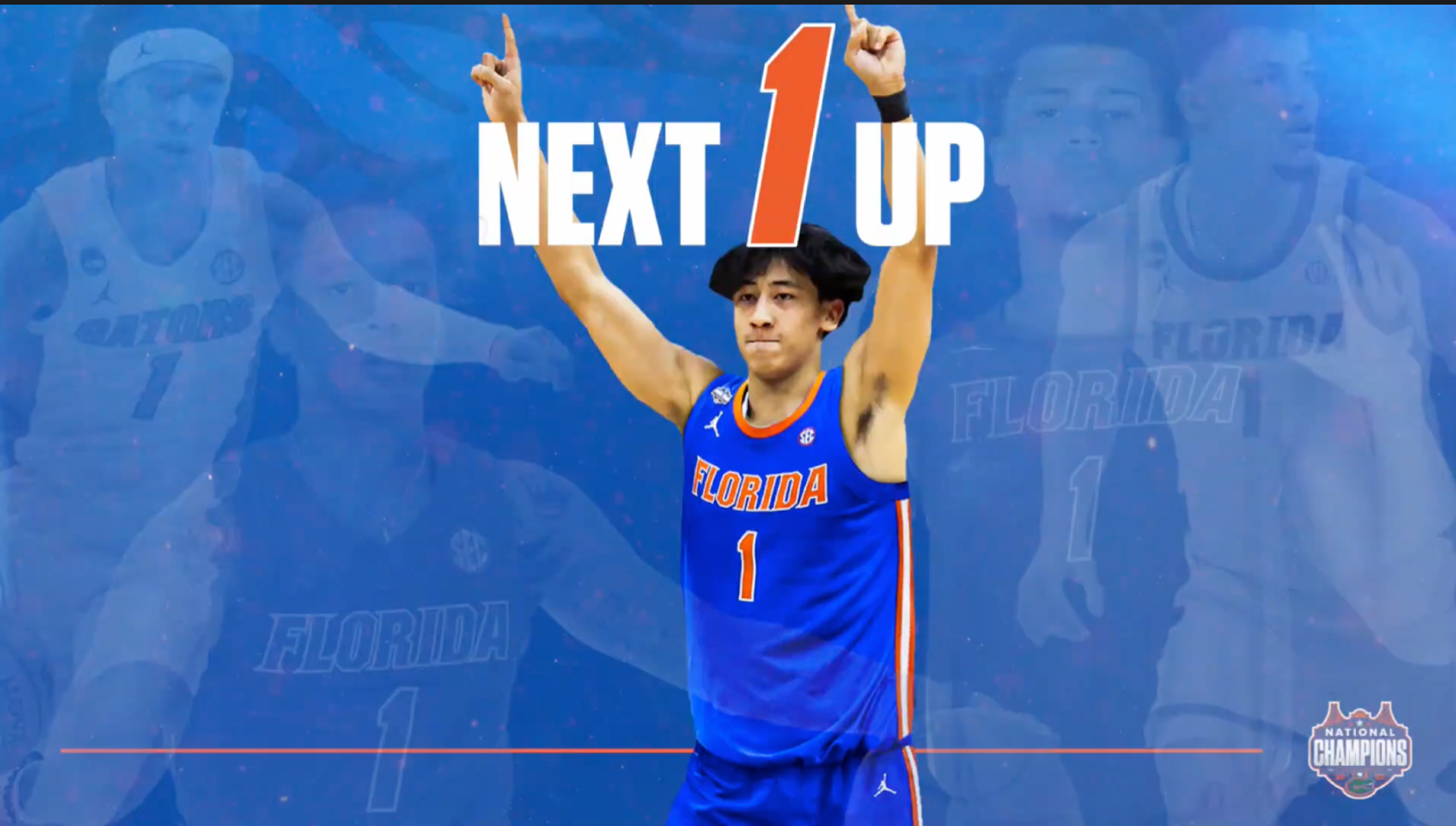 The final slide was a redesigned version of the initial one: Lee in his UF No. 1 uniform, arms raised, beneath the simple message: NEXT 1 UP.