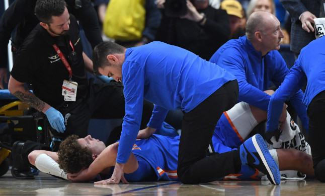 Moments into the game, Micah Handlogten collapsed in pain, away from the ball. Before Danielle could even process what had happened, her husband was already sprinting down the steps toward the court. She followed close behind, kneeling beside her son to offer comfort.