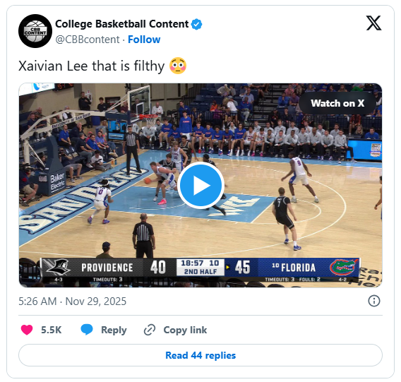 Providence (4-3) cut the UF lead back to 51-47 with about 16 minutes remaining, but Lee answered with a short pull-up jumper. Moments later, he fired a cross-court pass to Boogie Fland for a 3-pointer that forced the Friars to call timeout. Out of the stoppage, Fland drained another 3, followed by Lee’s offensive rebound and putback that pushed the lead to 14.